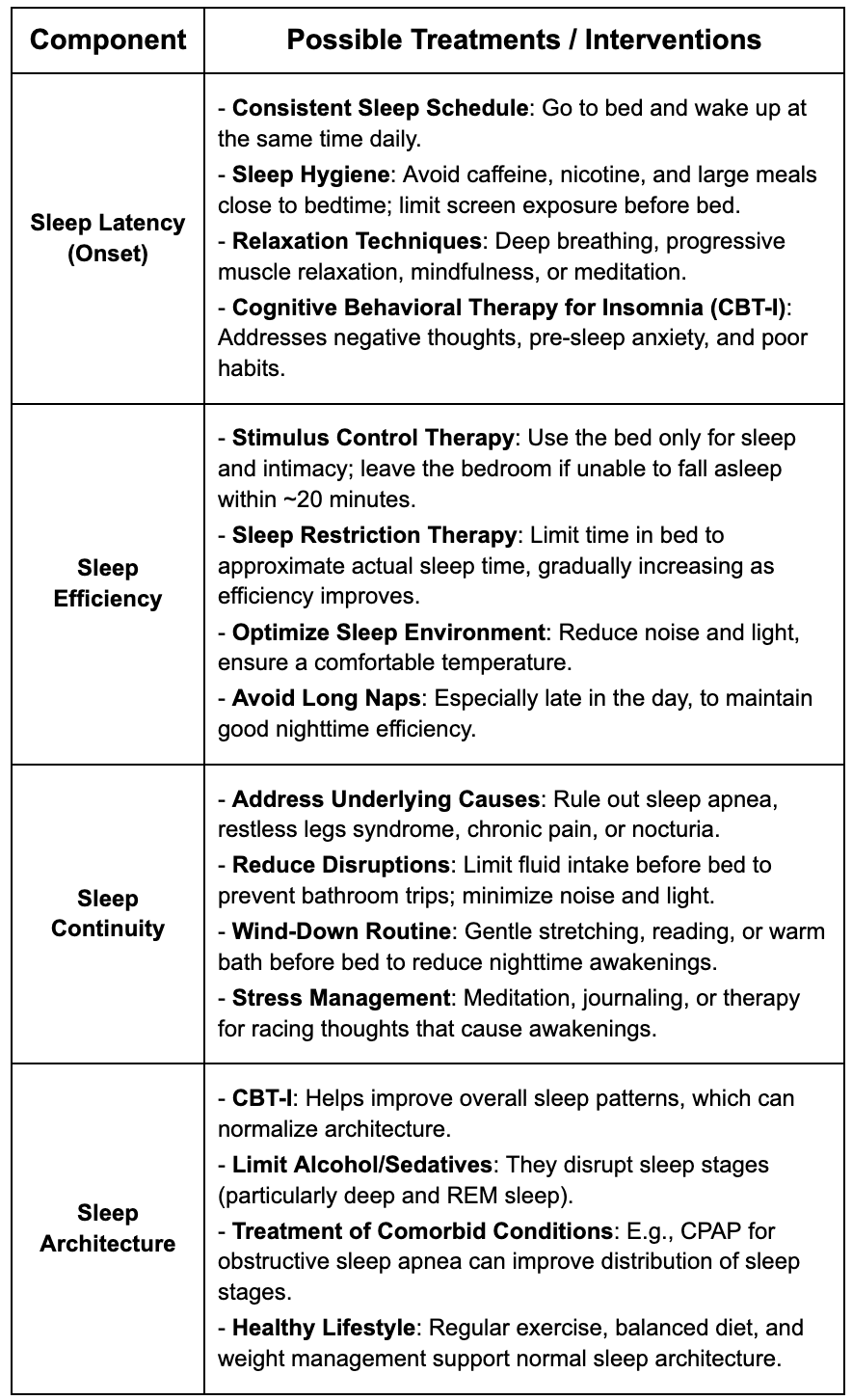 Sleep quality is broken down into components listed below, each of which can be manipulated to improve overall sleep: To check if you have a sleep quality issue, we recommend the Pittsburgh Sleep Quality Index (PSQI) calculator (find an online version that automatically calculates for you). The PSQI will tell you not only if you have a sleep quality issue but point you to which type you have.